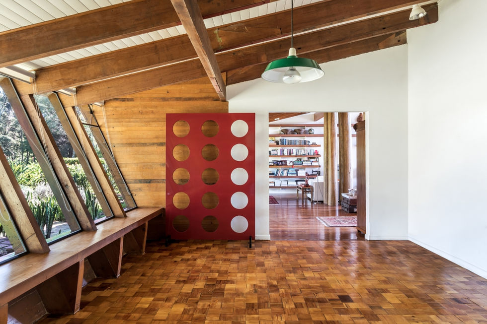 A casa com arquitetura modernista recebeu vigas de madeira com modulação repetida, criando movimento e emoldurando as amplas aberturas que privilegiam a entrada de luz natural e controle da temperatura.
