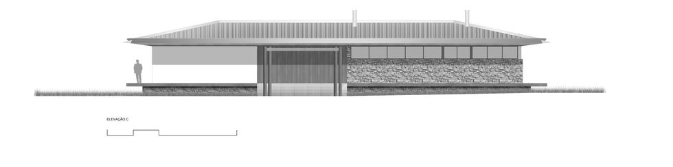 Em uma das pernas do U, a área íntima; na outra, lavanderia, lavabo e a churrasqueira com sua área de convívio. Unindo ambas, o centro da casa: cozinha, estar e jantar.